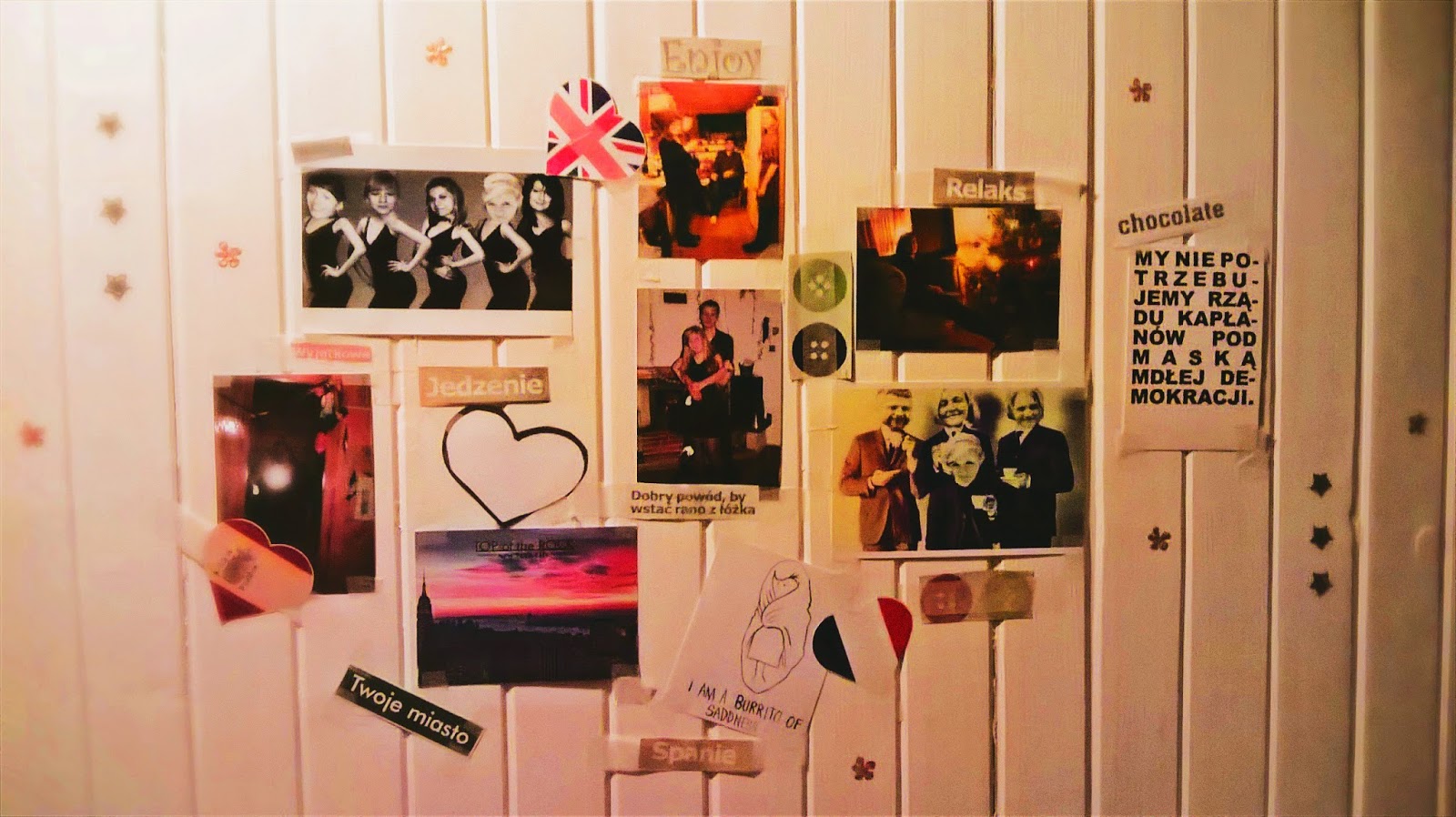 Tak czy siak, miałam dzisiaj słaby dzień. Jeden z tych dni, kiedy niby wszystko jest fajnie, nawet autobus spóźnia się specjalnie dla Ciebie, żebyś nie czekała na następny 20 minut, wreszcie świeci słońce, chociaż wiatr wciąż pizga złem, jesz dobrego kebaba na obiad z dokładnie takim sosem jaki zamówiłaś… ale jednak coś z tym dniem jest nie tak. Łypnęłam więc okiem na swoją ścianę, którą od czterech czy pięciu lat (z wątpliwym skutkiem) ozdabiały lekko pożółkłe tabelki z hiszpańską koniugacją, schematy pisania listów i inne dziwności przydatne do nauki języka. Łypnęłam raz. Łypnęłam drugi raz. Chwilę jeszcze poużalałam się nad sobą, pochlipałam nad rozrzuconymi na stole zdjęciami (bo jak mi smutno to lubię sobie powspominać i posmutać jeszcze bardziej), po czym postanowiłam zrobić sobie gazetkę ścienną. Hiszpańskie notatki wylądowały w koszu, a z kolei na ścianie (z pomocą katalogu ikei, połamanych nożyczek i plastra typu przylepiec, bo oczywiście taśmy w domu brak) wylądowały takie rzeczy.