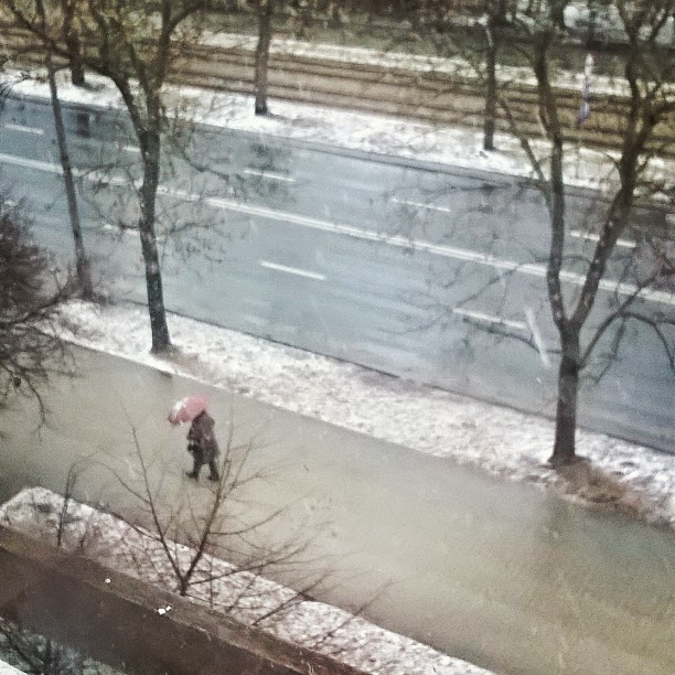 | Pani z różowym parasolem trafiła akurat na późnolistopadową śnieżycę na początku marca. |