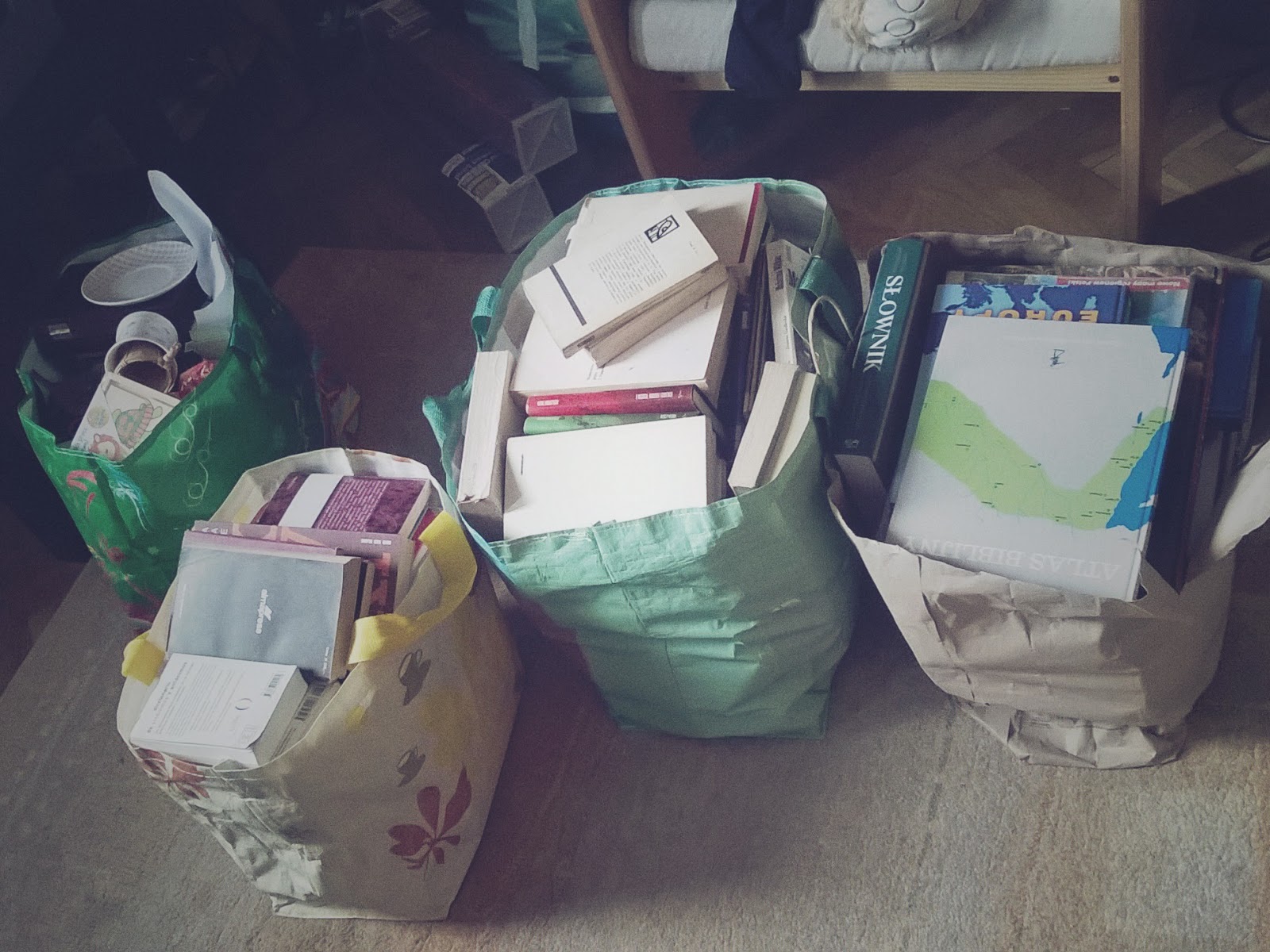 Okazuje się również, że ile książek i bibelotów nie byłoby na Twoich półkach to wszystko spokojnie da się zmieścić w czterech torbach i jednej walizce. No chyba, że wciąż chomikujesz i chowasz gdzieś po kątach podręczniki z liceum – wówczas dolicz jeszcze ze dwa worki na śmieci i karton.